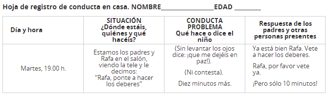 Cuando le digamos algo y el niño no obedezca, en la primera columna apuntaremos el día y la hora que es; a continuación, tal y como lo hemos hecho en el ejemplo, escribiremos el resto. En este caso, el registro nos muestra cómo hemos hecho lo contrario de lo que deberíamos. Al final el niño ¡se ha salido con la suya! y nosotros hemos actuado incorrectamente, pues le hemos enseñado que contestando mal, no haciéndonos ni caso e imponiendo él las condiciones, nosotros terminamos cediendo. La siguiente vez hará algo parecido, pues le dio buen resultado.